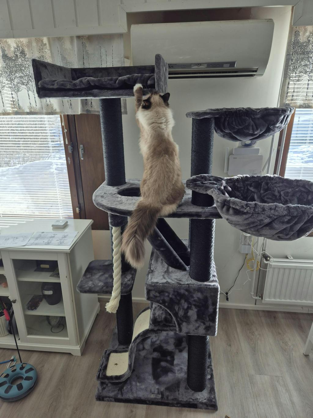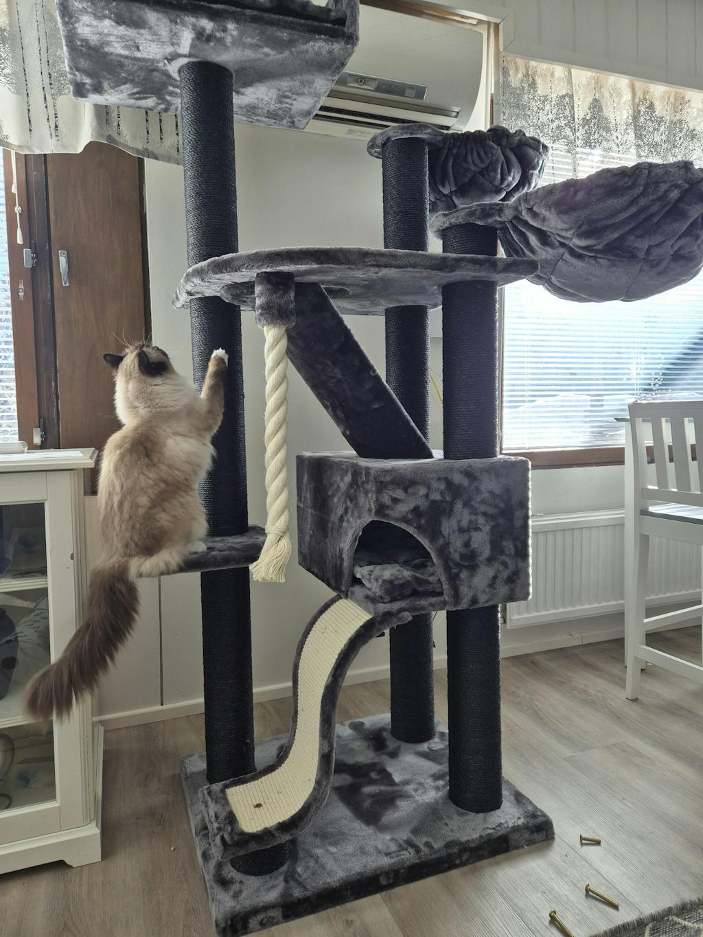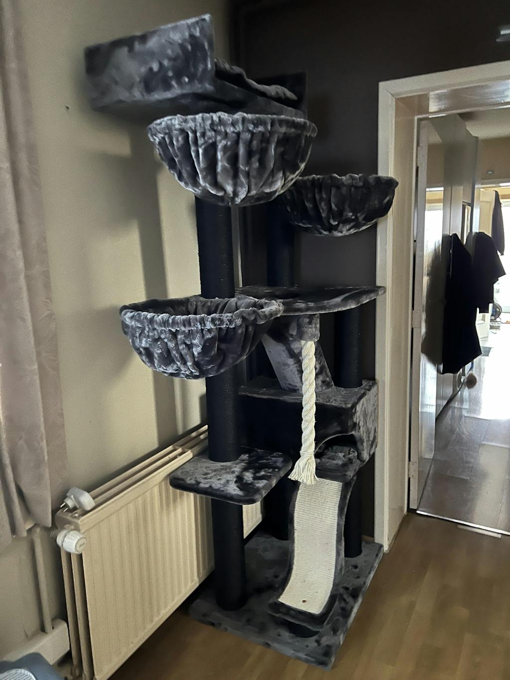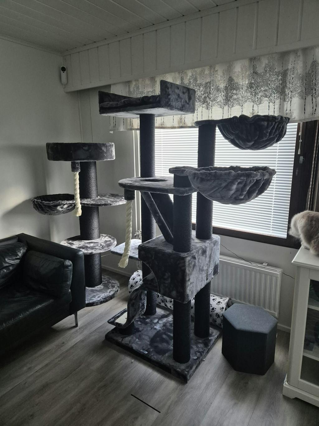 Monipuolinen, tyylikäs ja erittäin laadukas raapimapuu! Vakaa suurempienkin kissojen käyttöön (meillä ragdolleja). Kangas on ihanan pehmeää!! Luulisin ettei tähän jää irtokarvojakaan samoin kuin muiden valmistajien raapimapuihin koska kangas on todella silkkisen pehmeää. Aivan ihana ja kissatkin tykkää.
